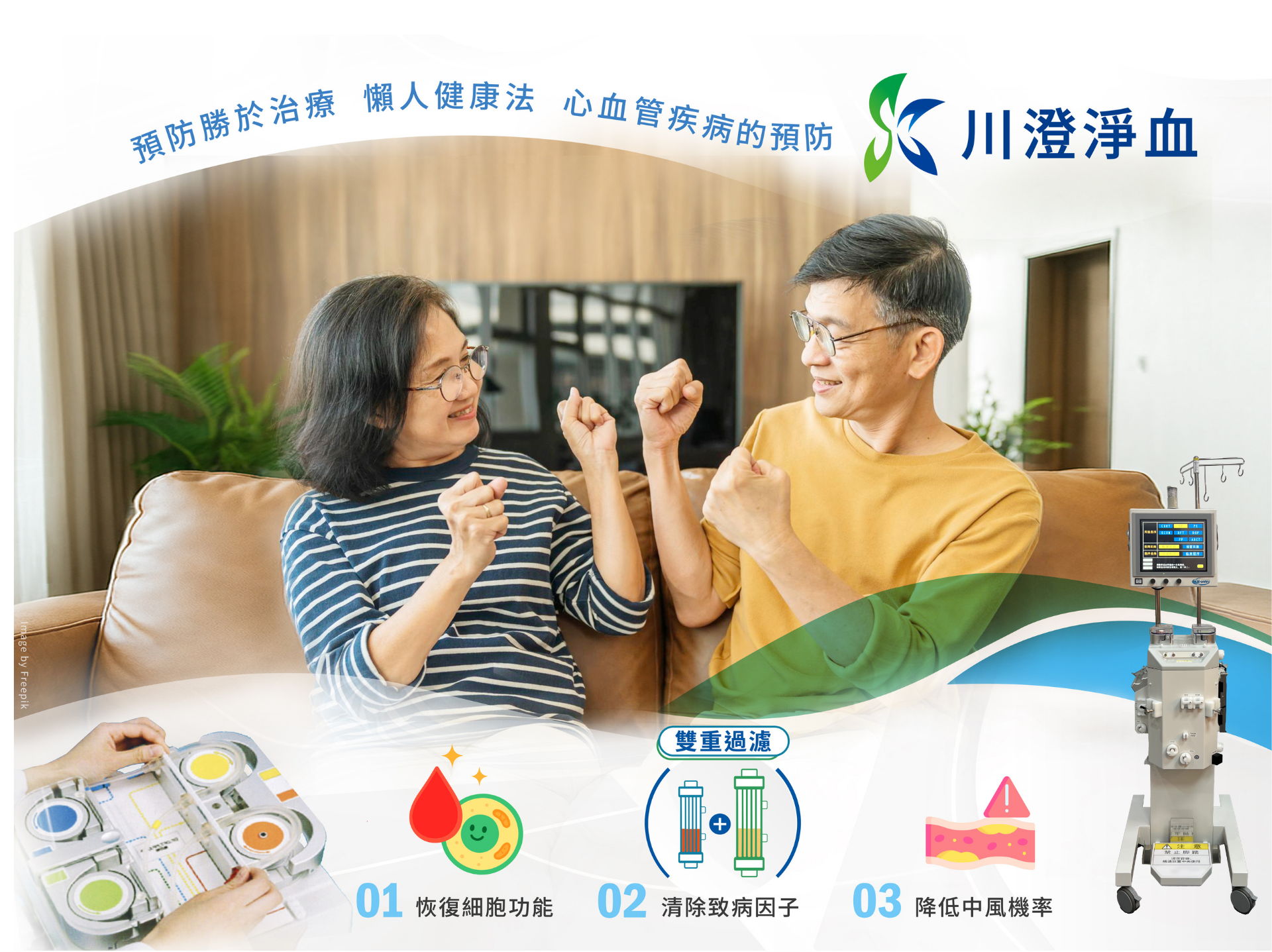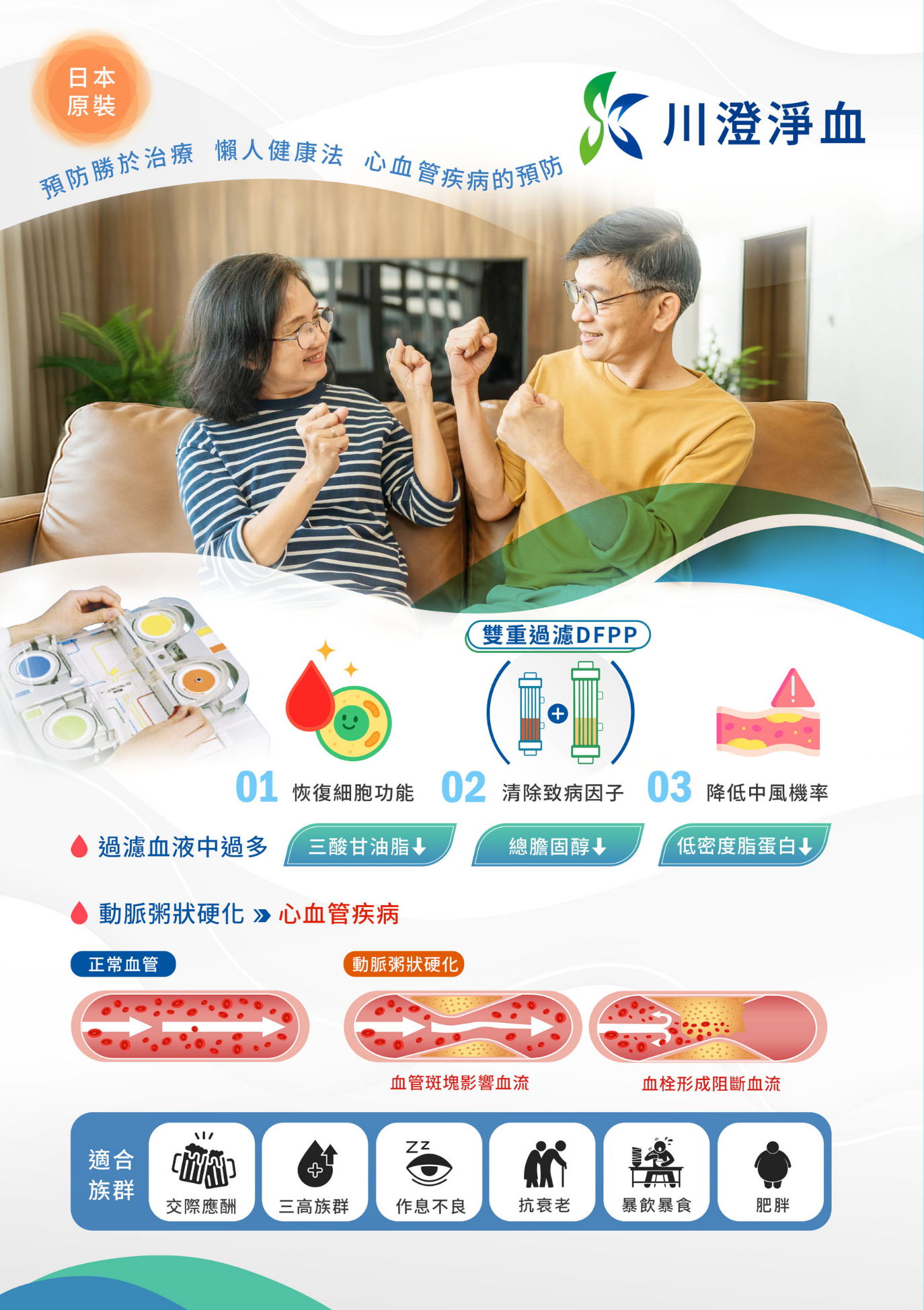 由日本引進最新雙重血漿分技術DFPP,利用血漿分離濾心有選擇性去除血液含有大分子量致病物質的血漿成份,降低血液濃稠度、改善血液循環。療程中所有耗材皆為一次性使用,沒有交叉感染的風險。