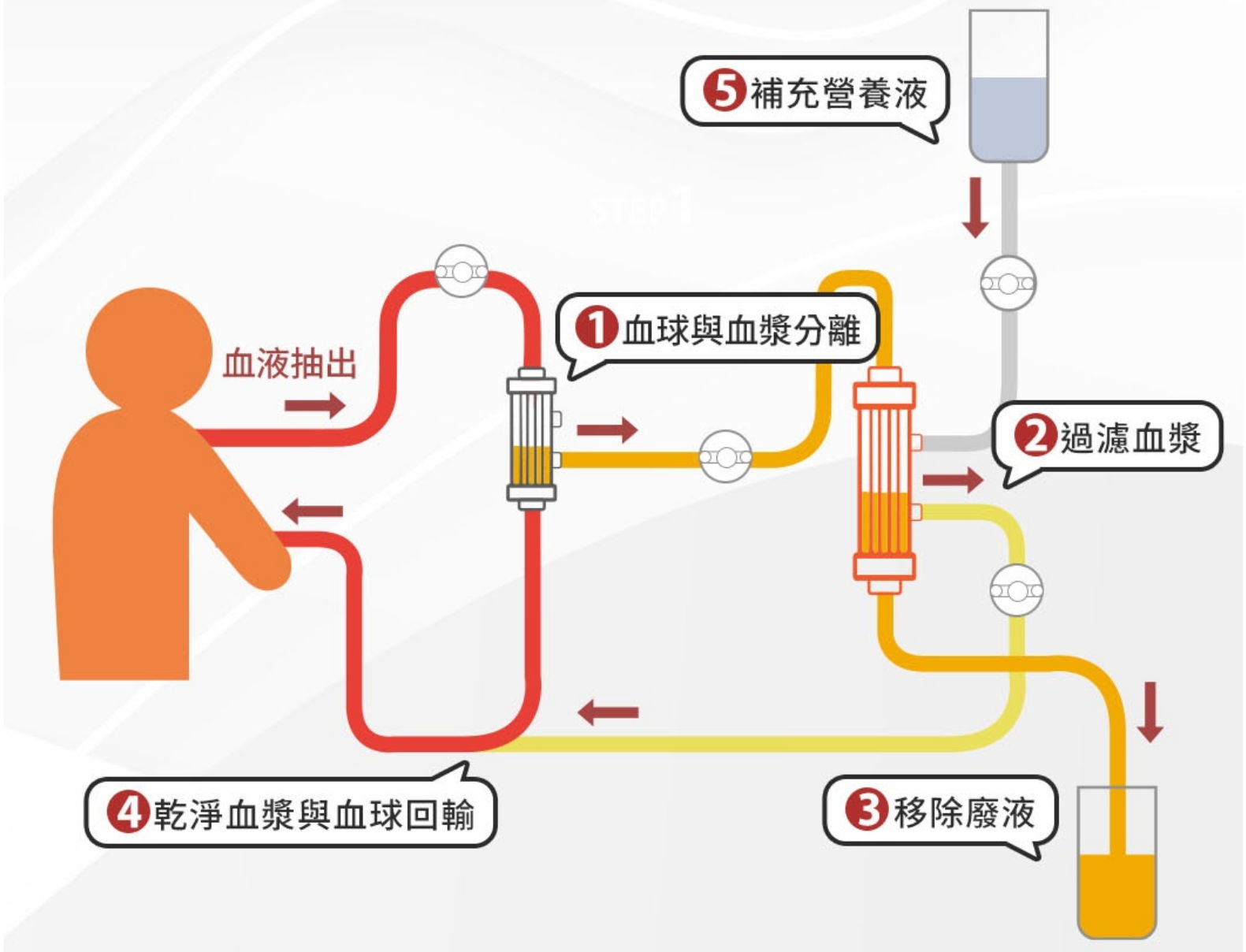 血液淨化是透過兩種不同孔徑的血漿成分分離器,進行兩段式過濾。首先,利用血漿過濾器將全血分離為血漿與血球,再讓血漿通過孔徑更小的血漿成分分離器,選擇性濾除血漿中的不良大分子物質,如低密度膽固醇、三酸甘油酯、重金屬、塑化劑及發炎物質,最後將淨化後的血漿與血球回輸體內。
